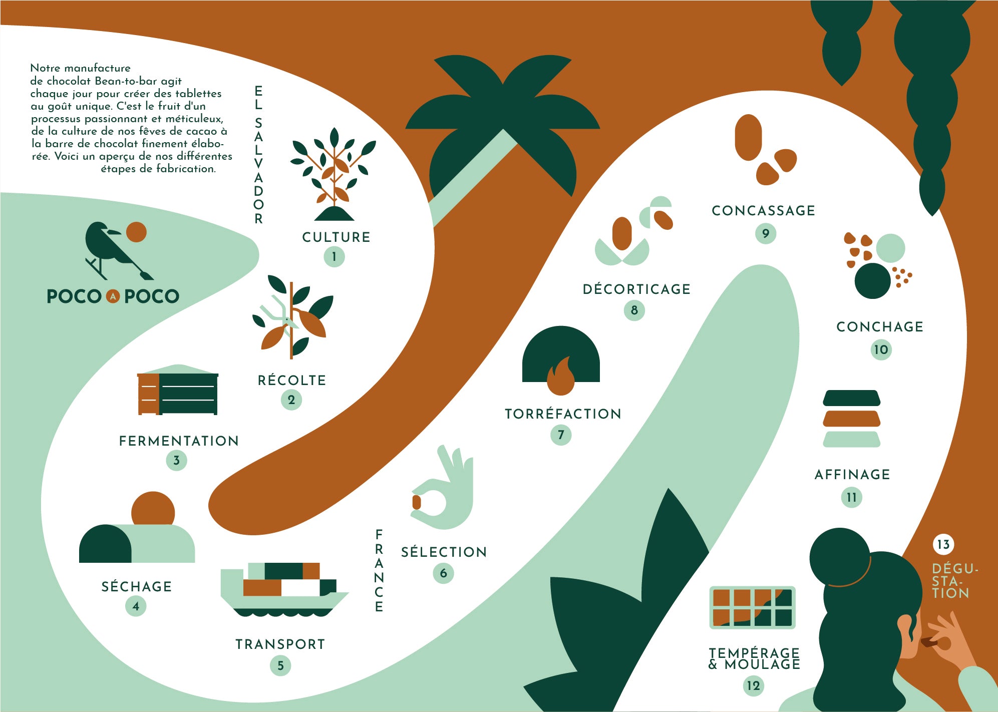 Notre engagement envers la qualité, l'artisanat et la transparence se reflète dans chaque étape de notre processus de fabrication. Nous croyons fermement que le respect du temps, des ingrédients et des traditions permet de créer des chocolats véritablement exceptionnels. C'est cette philosophie qui guide chaque création de Poco a Poco, du grain de cacao à la tablette que vous dégustez.